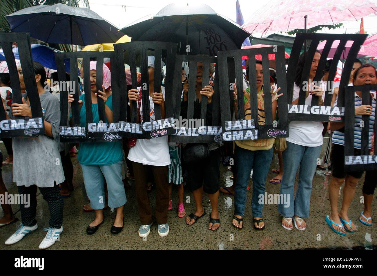 Anti Arroyo Protesters Shout Slogans As They Hold Mock Prison Bars During A Rally Outside The Veterans Memorial Medical Center In Quezon City Metro Manila December 9 2011 Philippine Security Forces Transferred Former
